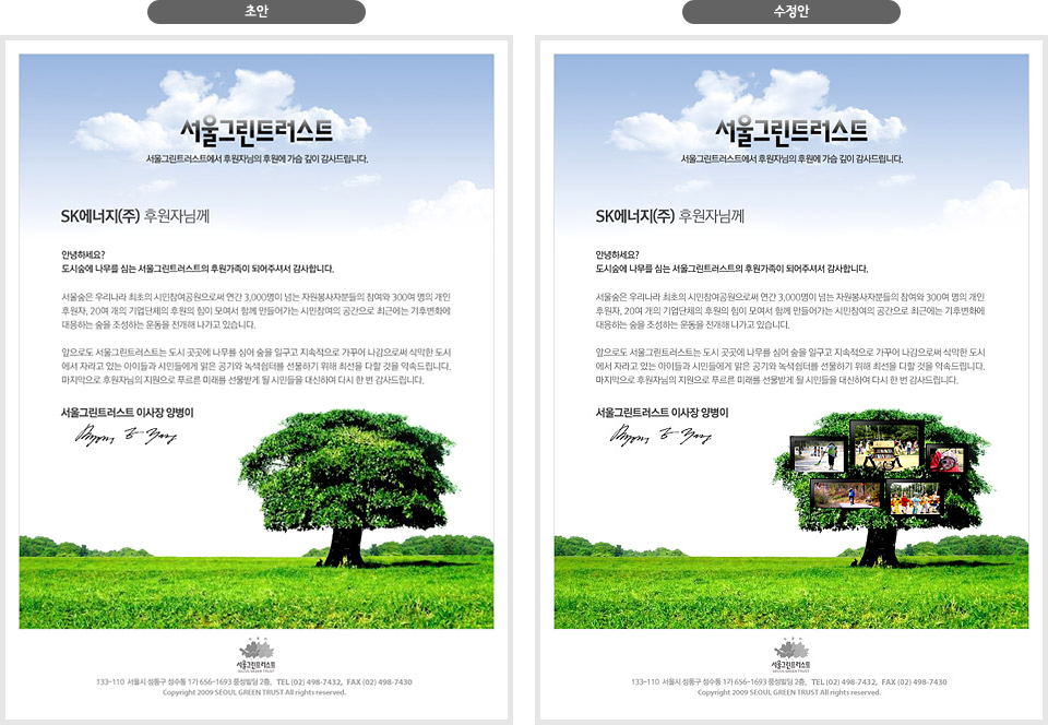 시원&청정 컨셉으로 1차 디자인안을 완료한 후 재단 측 요청에 따라 활동 사진 액자가 나무 위에 올려져 있는 듯한 느낌으로 합성했다.
