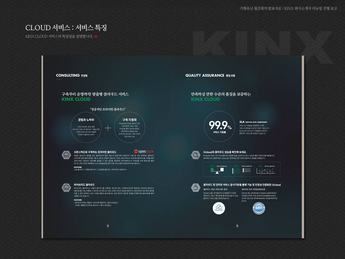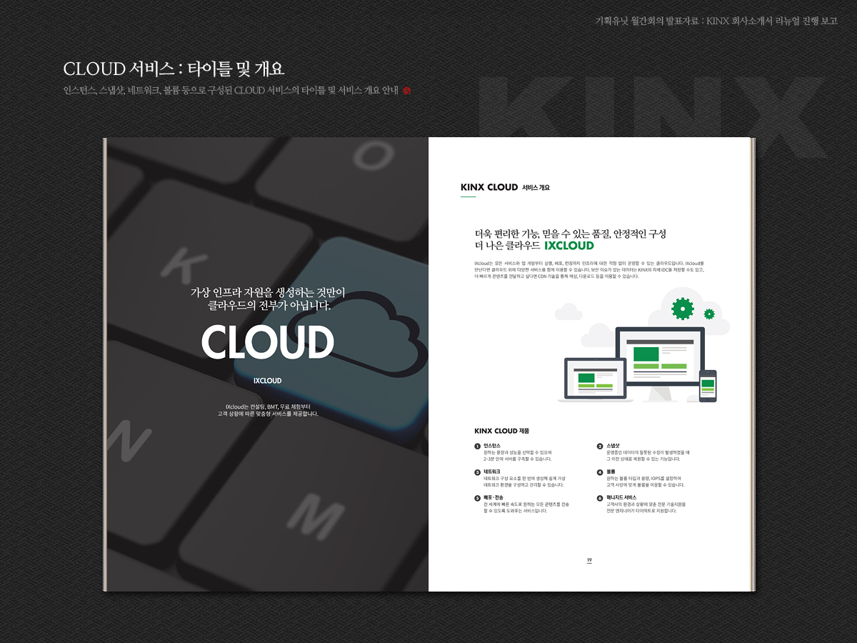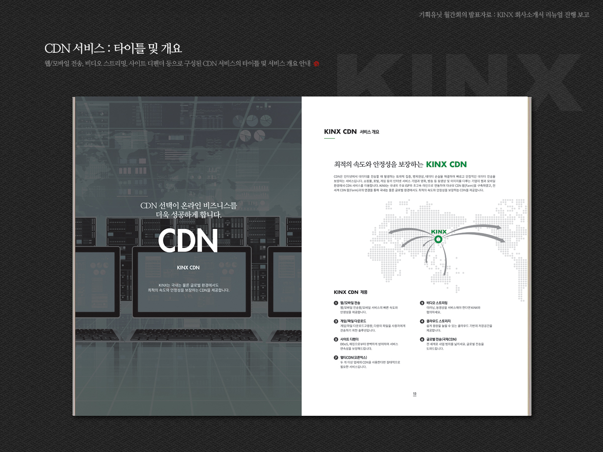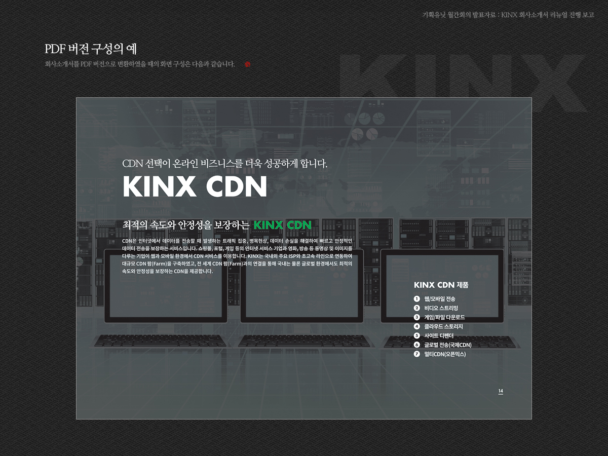 현장에서는 인쇄, 제본한 실물 회사소개서보다는 주로 PDF, PPT 파일을 사용하기 때문에 PDF 파일 제작은 거의 필수라고 할 수 있다. 아래는 세로로 제작한 회사소개서를 가로 형태의 PDF로 재구성 하였을 때의 샘플을 소개한 페이지들이다.