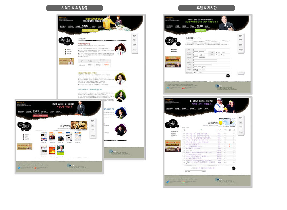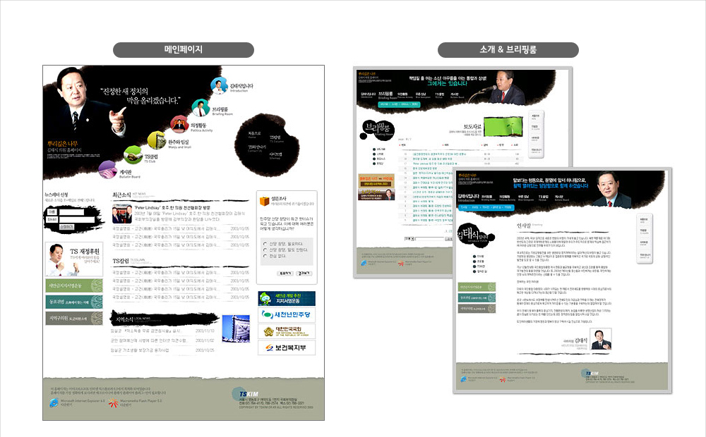 학교 선배의 소개로 작업한 민주당 김태식 의원(당시 국회부의장)의 17대 총선용 홈페이지. 그림같은 느낌(?)의 디자인을 요청해서 당시에는 생소했던 캘리그라피를 기반으로 작업하였으며 영화 <취화선>이나 <스캔들>의 프로모션 사이트를 참조했다. 먹으로 표현된 요소의 대부분을 플래시를 이용해 먹이 번지는 무브를 주었고 글꼴도 명조체 계열의 폰트를 메인으로 사용해 배경과 어울리도록 했다.