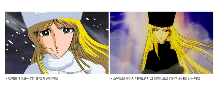 메텔이 입고 다니는 검은 코트. 이 옷은 서양에서 여자들이 장례식 때 입는 문상복이다. 메텔은 자신 때문에 기계제국의 이슬로 사라져간 무고한 소년들의 죽음을 애도하는 뜻에서 그런 옷을 입고 있었던 것이고, 이렇게 죄책감을 느끼고 있으면서도 계속해서 소년들을 데려가는 메텔의 행동이 가짜 하록의 눈에는 더없이 괘씸하게 보였던 것이다. 그런데 이번에 데려가는 철이라는 소년은 파우스트의 아들임이 분명했다. 이따금씩 메텔의 품에 안겼던 철이는 "마치 엄마 품속 같아"라는 말을 곧잘 하곤 했는데 이것은 단순히 모성애에 대한 보상심리가 아니라 메텔이 자신의 친어머니라는 것을 느낄 만큼 철이가 확실히 파우스트의 아들임을 나타내는 암시였다.