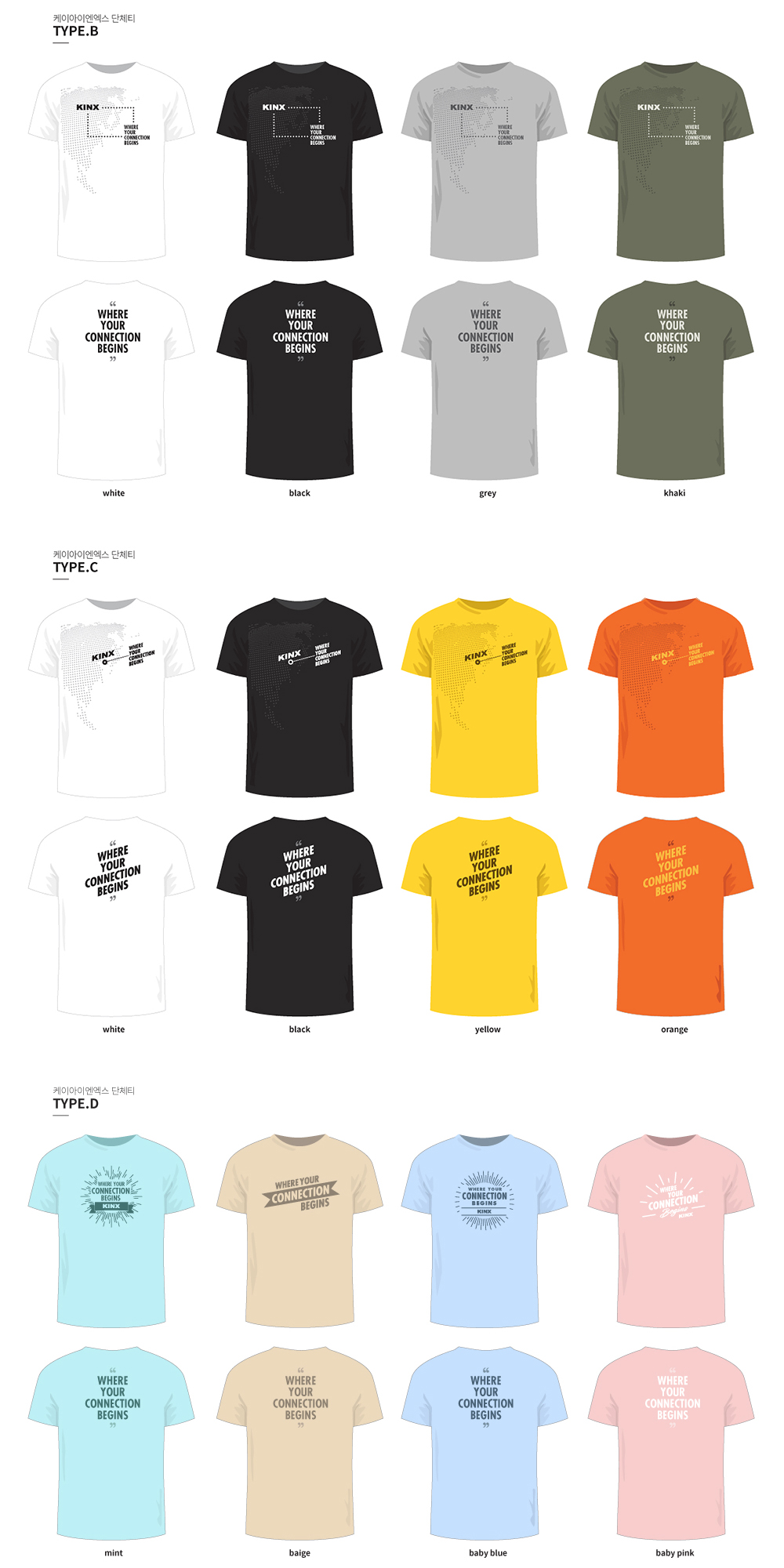 회사의 슬로건이 들어갔으면 좋겠다는 의견이 있어 급하게 'Where Your Connection Begins(당신의 연결이 시작되는 곳)'라는 회사의 서비스를 내포한 문구를 팀 내에서 만들어 티셔츠에 삽입하고, Network, World 등 회사 서비스를 시각적으로 느낄 수 있는 몇 가지 일러스트를 그려 시안을 추가했다. 위에서 A타입이 빠진 이유는 A타입은 그대로 최종안으로 확정되어서 아래 최종안에만 삽입했기 때문이다.