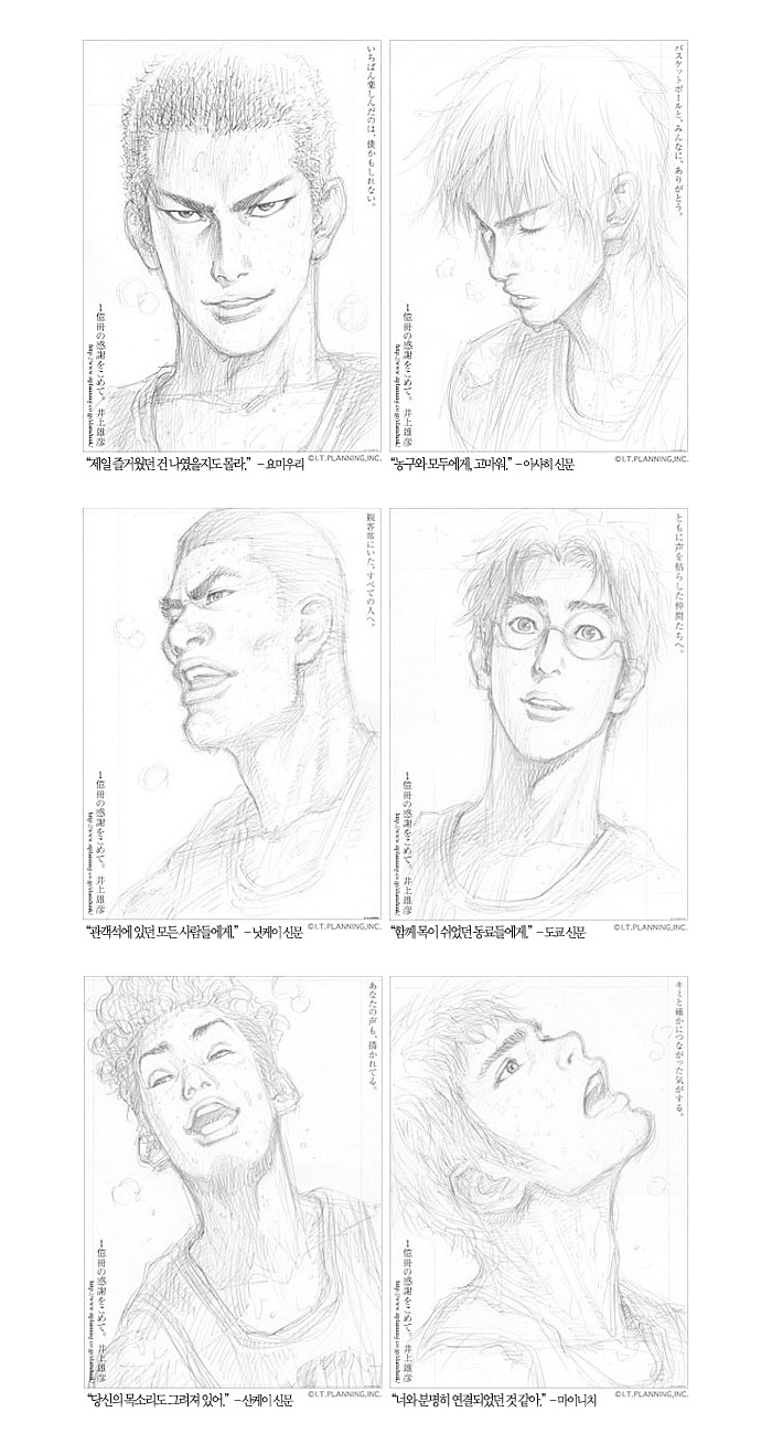 슬램덩크가 1억 부의 발행을 기록한 후 작가인 '다케히코 이노우에'가 산케이, 아사히, 마이니치, 요미우리, 닛케이, 도쿄 등 6개 일본 조간신문에 전면 광고로 게재해 화제가 됐던 일러스트들이다. 기사들에 따르면 6개 신문을 합친 광고요금은 '정가라면' 약 1억6천만 엔(당시 환율로 15억 원 정도). 이 광고가 게재된 신문들은 매진되고 현재까지도 옥션 등에서 비싼 값에 거래되고 있다고 한다.
