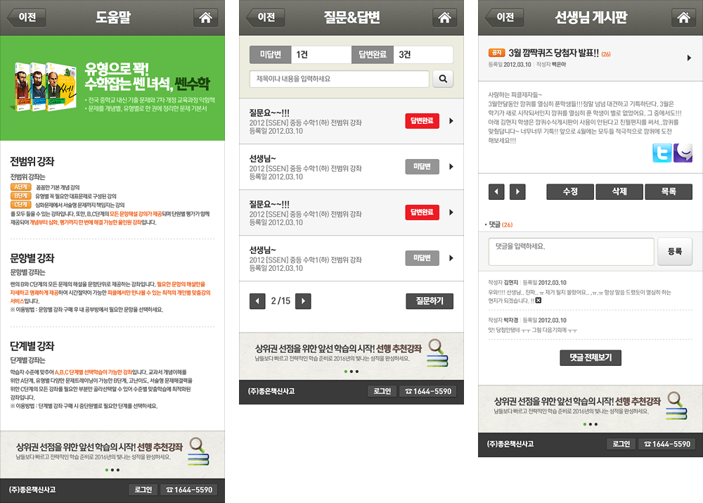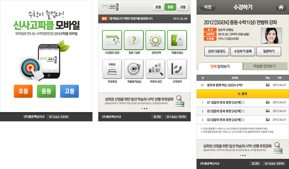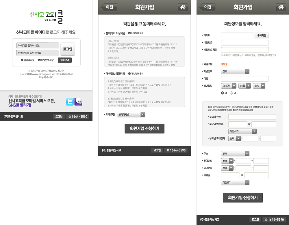 모바일 환경에서도 신사고피클(쎈닷컴)이 제대로 서비스 될 수 있도록 제작한 모바일웹 버전이다. 처음으로 해본 모바일 작업으로 PC와 모바일의 해상도 차이에 대한 개념도 잘 모르던 때라 작업에 어려움이 많았다.