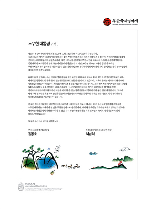 당시 부산국제영화제에서 대통령 초청을 목적으로 만든 초대장 정도 되겠다. 나는 나왔지만 부산영화제에서 계속 일하던 민권형이 급하게 요청해서 서둘러 만들어 드렸다. 인쇄용은 아니고 e메일로 청와대 의전 담당에게 보내는 거라고 들었다. 내 인생에서 아버지, 어머니 외에 가장 존경하는 분이 노무현 대통령인데 물론 그분께서 직접 보시지는 않으셨겠지만 그분께 뭔가를 드린다는 마음이 들어 혼자 들떠 작업했던 기억이 난다.