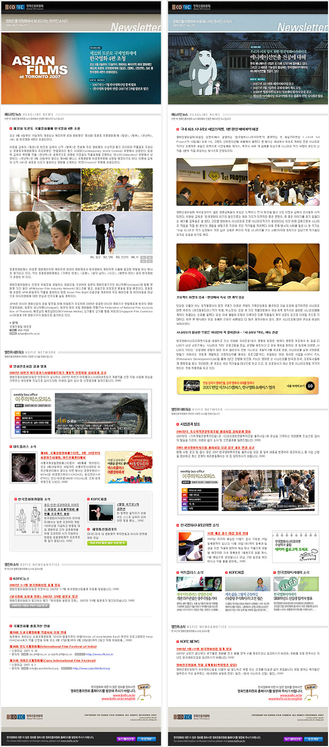 영화진흥위원회 홍보팀에서 근무하는 지인의 소개로 2007년 7월부터 12월까지 6개월간 진행했던 작업이다. 영진위 측으로부터 콘텐츠를 받아 디자인&코딩을 한 후 전달하는 방식. 2주에 한번씩 발행으로 전체적인 레이아웃은 매회 같고 콘텐츠만 바뀌는 형식이라 틀을 잡았던 첫 회 이후에는 작업이 어렵지 않았다. 반면 보수는 꽤 높아서 당시 나에게는 가뭄에 단비 같은 일이었다.