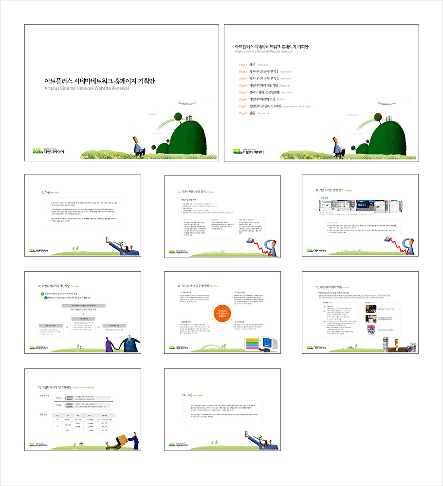 영화진흥위원회에서 운영하는 독립영화상영관 '아트플러스' 사이트 개편 기획안. 기획안 콘텐츠와 디자인까지 모두 맡아 진행했다. 결과는.. 당연히 실패. 내가 지금 봐도 설득이 안 되는 콘텐츠다. 당시 젊은 혈기(27살)에 PT 가서 "이쪽 일을 너무 모르시는 것 같아요."라고 영진위 담당자한테 개소리 한 게 제일 영향이 컸을 듯 ㅋ 부끄러운 기억이다.