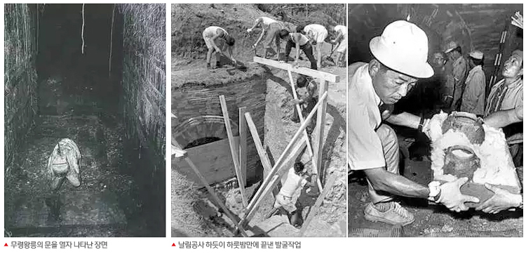 일본인 교사 '카루베'가 송산리 고분군에 있는 제6호분을 파헤친 후 39년이 지난 1971년 7월 5일 6호분의 뒷산. 배수로를 파던 인부의 삽에 뭔가 단단한 물체가 부딪혔다. 그것은 흙을 구워 만든 벽돌이었다. 조금씩 파내려가 보니 벽돌을 쌓아 만든 아치형 구조물이 보였다. 카루베가 죄다 도굴해버린 6호분은 벽면 사방에 사신도만 남고 도굴되는 과정에서 천장이 훼손돼 물이 스며들었다. 또 여름만 되면 무덤 안과 밖의 기온 차이로 이슬이 생겨 벽화가 훼손되고 있었다. 그래서 그해 여름부터 배수로를 만들기 위해 뒤쪽 언덕을 파내려가게 되었다. 그러다 인부의 삽날에 왕릉 입구의 전돌이 걸린 것이다. 인부들은 서둘러 공사 책임자인 김영배 국립공주박물관장을 찾았다.