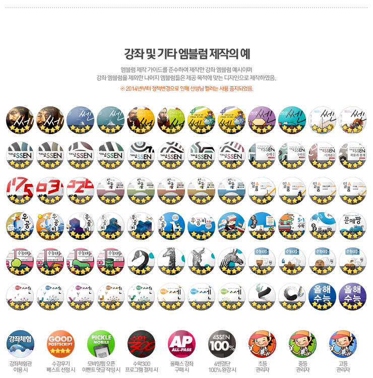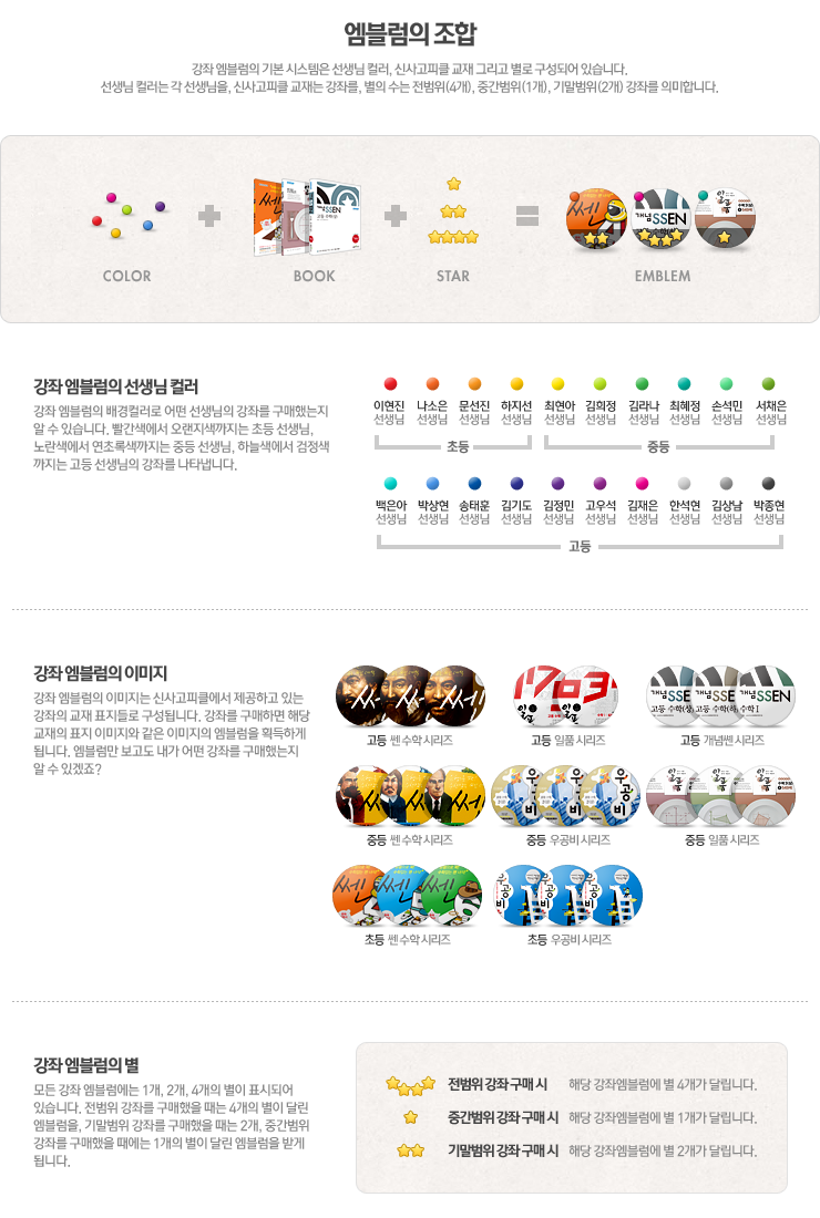엠블럼은 특수한 경우를 제외하고는 모두 '강좌'와 '범위', '선생님' 이 세 가지의 의미를 내포하고 있어야 했는데 각각 '교재 표지'와 '별', '강사 컬러'로 조합을 구성한다는 아이디어를 내고 디자인까지 직접 완성했다. 지금 생각해보면 디자이너의 업무 영역을 벗어난 꽤나 칭찬 받을 성과인데 당시에는 디자이너의 당연한 업무로 받아들여졌는지 완성 후 별도의 피드백을 받은 기억이 없다. (너무하네)